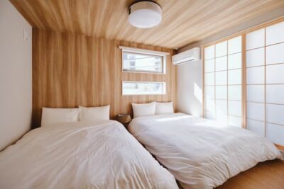 やさしい木目の壁と、真っ白なリネンが心地よく調和した一室